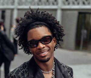 PARIS, FRANCE – JUNE 26: d4vd is wearing a tailored blazer adorned with intricate silver floral embroidery paired with striking silver jewelry, black sunglasses, and carefully styled curly hair. Seen during AMIRI the Menswear Spring/Summer 2026 show as part of Paris Fashion Week on June 26, 2025, in Paris, France. (Photo by Olga Gasnier/Getty Images)