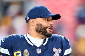 LANDOVER, MARYLAND – DECEMBER 25: Dak Prescott #4 of the Dallas Cowboys talks to media after his team’s 30-23 victory against the Washington Commanders at Northwest Stadium on December 25, 2025 in Landover, Maryland. (Photo by G Fiume/Getty Images)