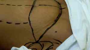 Surgical markings on Kristie’s body delineate cutlines for the abdominoplasty operation, and the area where liposuction will be performed. After losing some 80 pounds, Allen wanted to have the loose flab of her stomach removed by an abdominoplasty operation, and to have liposuction on her thighs. She decided to travel to South Africa, where the cosmetic surgery is less expensive than in the USA, and of a high standard. Between her consultations and surgery, Kristie also had the opportunity to experience South Africa as a tourist. (Photo by Louise Gubb/Corbis via Getty Images)