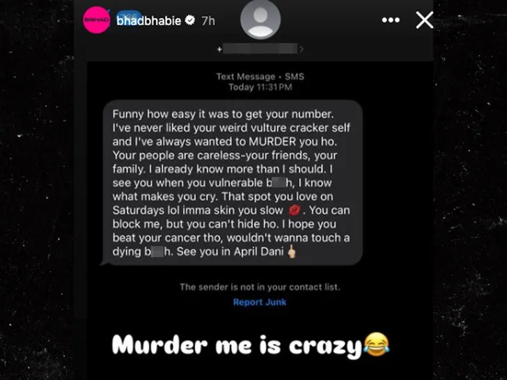 Rather than showing fear, Bhad Bhabie seemed unfazed, posting a screenshot of the message with the caption, “Murder me is crazy,” followed by a laughing emoji.