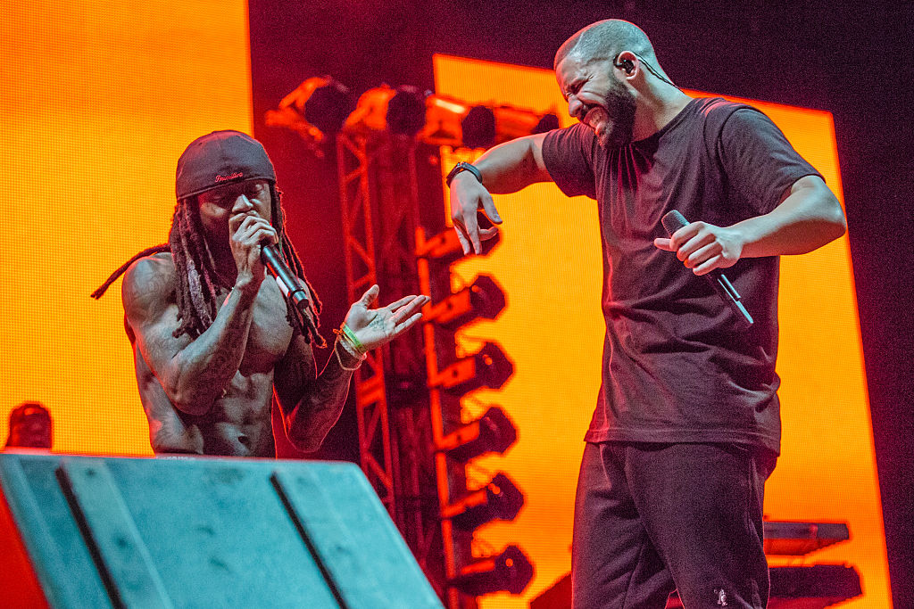 NEW ORLEANS, LA – AUGUST 28: Lil Wayne (L) and Drake perform at Lil Weezyana Festival at Champions Square on August 28, 2015 in New Orleans, Louisiana. (Photo by Josh Brasted/WireImage)
