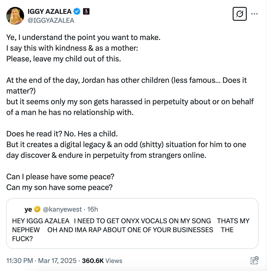 Iggy quickly shut down the mention, making it clear she wanted no part of the drama. “Ye, I understand the point you want to make. I say this with kindness & as a mother: Please, leave my child out of this,” she wrote.