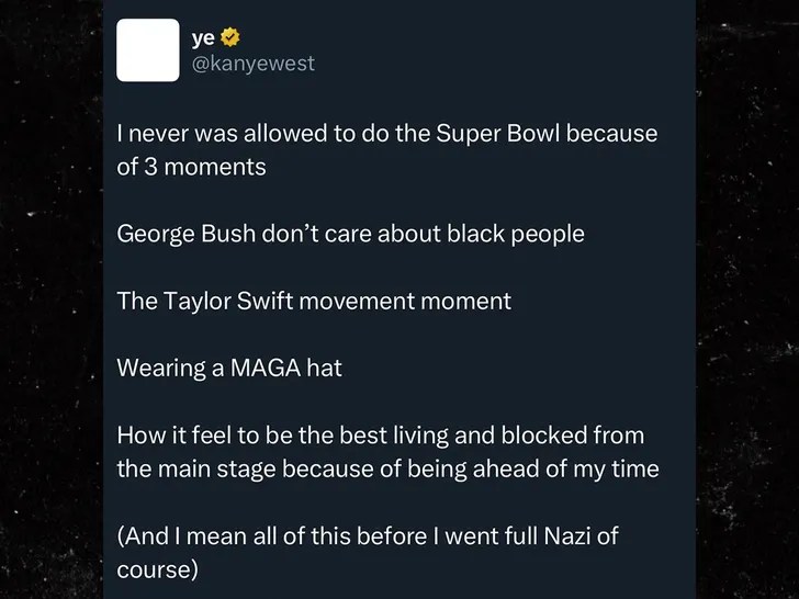 In the same deleted post, West also invoked his polarizing political stunts and antisemitic remarks. He implied those controversies, including his visit to the White House in a MAGA hat and his more recent hateful rhetoric, came after he was already “banned” from the Super Bowl. By framing himself as a visionary misunderstood in his time, West tried to shift focus from his self-inflicted fallout to the idea of cultural censorship.