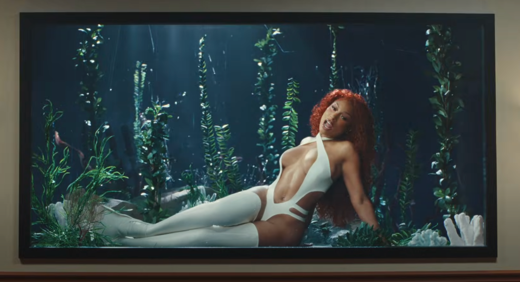 Coming in just under three minutes, the video takes fans on an interesting journey that includes melting clocks, security guards with fish heads, and even a shot where the rapper shows off her toned-up physique in an office fish tank.