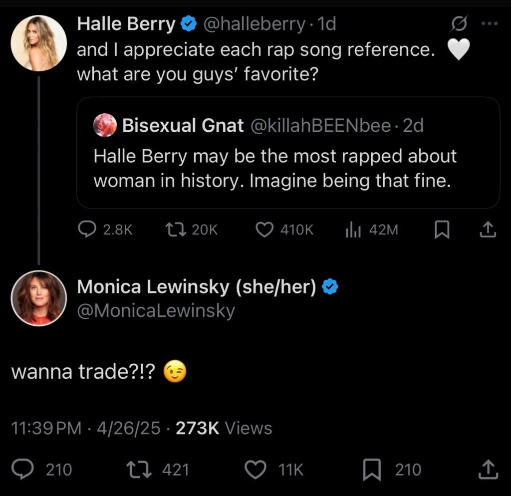 Monica Lewinsky and Halle Berry found themselves in a lighthearted exchange this weekend over their unexpected roles as lyrical muses in hip-hop. The moment unfolded after Berry, 57, responded to a viral post tallying how frequently her name has been dropped in rap songs over the decades.