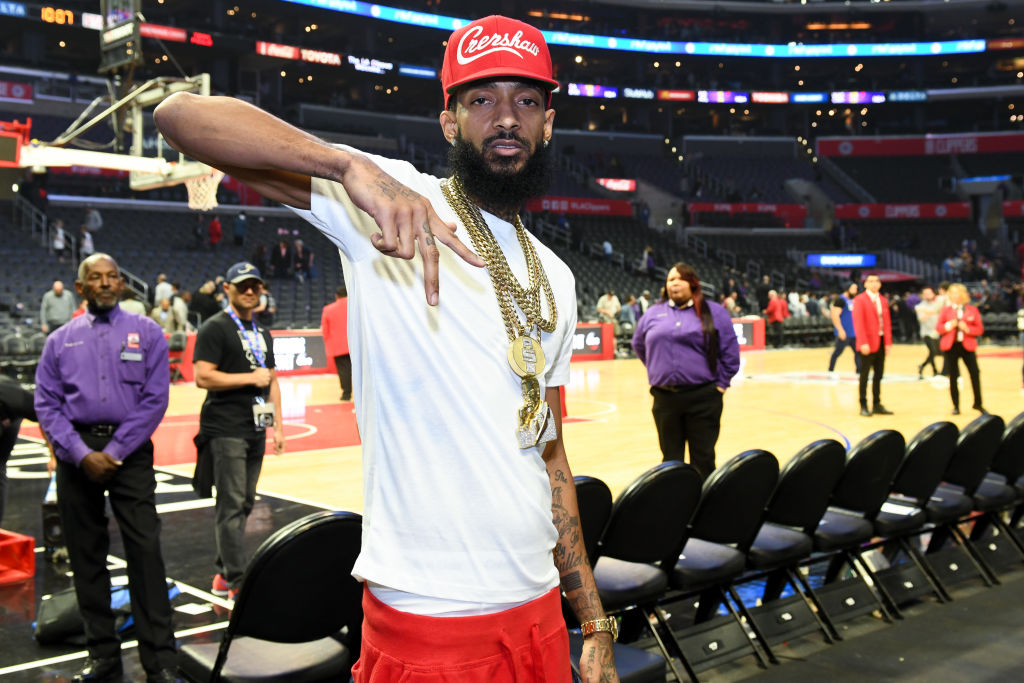 LOS ANGELES, CA – JANUARY 17: Rapper Nipsey Hussle attends a basketball game between the Los Angeles Clippers and the Denver Nuggets at Staples Center on January 17, 2018 in Los Angeles, California. (Photo by Allen Berezovsky/Getty Images)