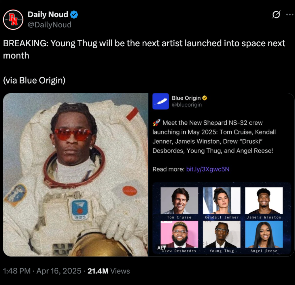 On Wenesday (Apr. 16), a parody X account, Daily Noud, shared a post about the now-debunked flight. A slew of other celebrities — like Kendall Jenner, Tom Cruise, Angel Reese, and social media personality Druski — were also rumored to be joining the space crew.