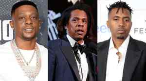 Boosie (Photo by Carmen Mandato/Getty Images) Jay-Z (Photo by Dimitrios Kambouris/Getty Images for The Rock and Roll Hall of Fame ) Nas (Photo by Hippolyte Petit/Getty Images for Tribeca Festival)