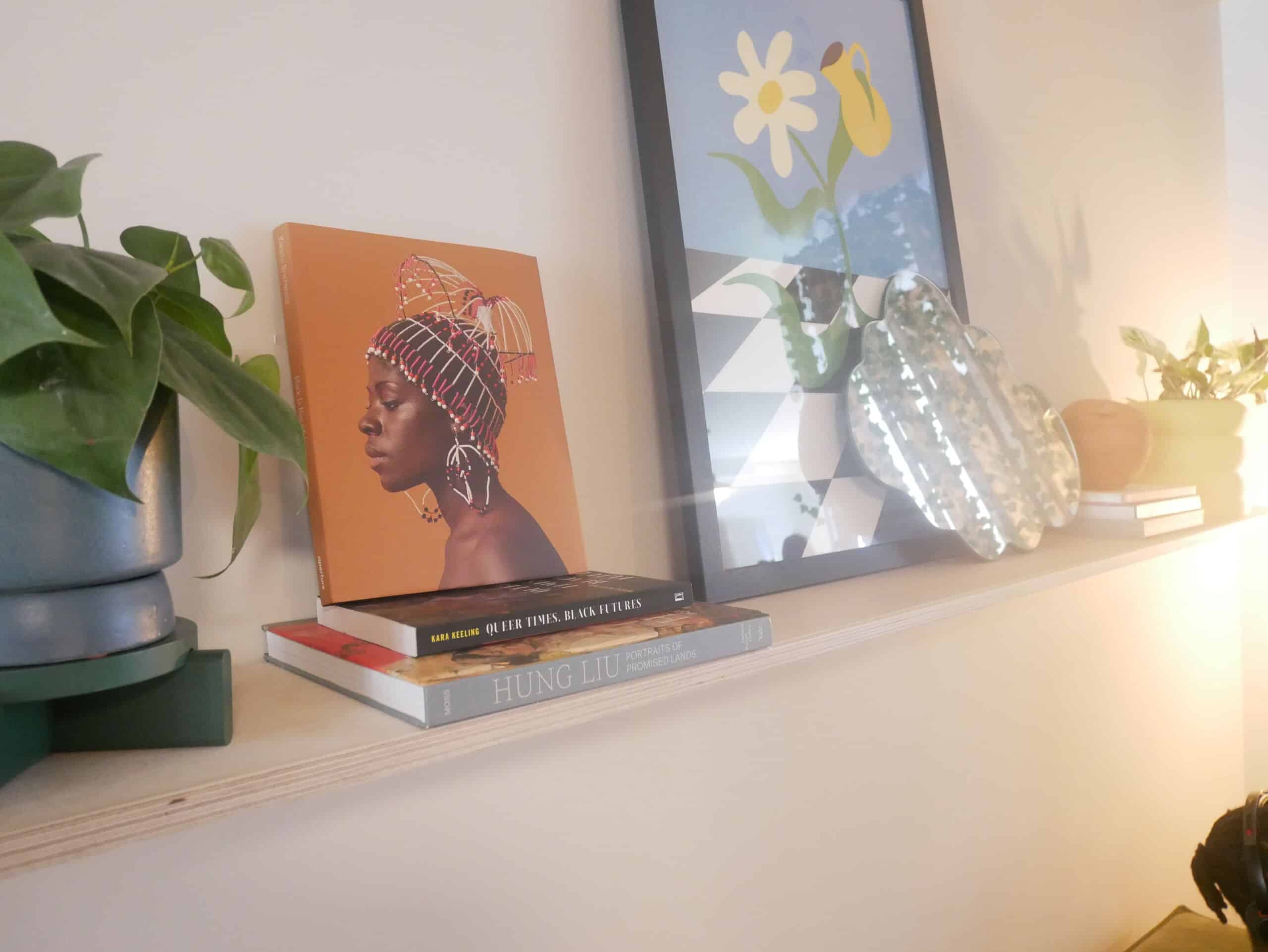Naj Austin organizes books at the Somewhere Good co-working space in Bedstuy Brooklyn