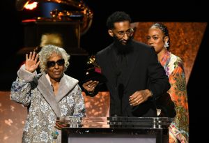 LOS ANGELES, CALIFORNIA – JANUARY 26: (L-R) Angelique Smith and Samiel Asghedom, mother and brother of the late rapper Nipsey Hussle, accept Best Rap Performance for “Racks in the Middle” onstage during the 62nd Annual GRAMMY Awards Premiere Ceremony at Microsoft Theater on January 26, 2020 in Los Angeles, California. (Photo by Jeff Kravitz/FilmMagic)