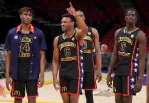 HOUSTON, TEXAS – MARCH 28: LeBron James and son, Bronny James attend 46th Annual McDonalds All American Games with Halftime Performance by Don Toliver on March 28, 2023 in Houston, Texas. (Photo by Bob Levey/Getty Images)